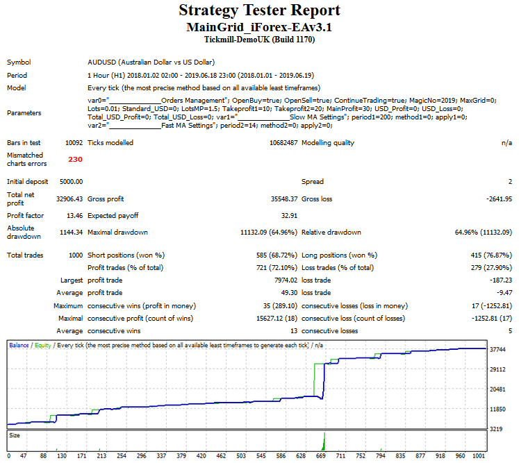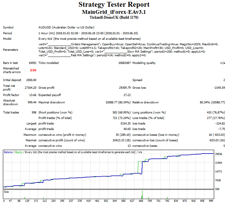 1/ التجربة الأولى: مدة سنة و نصف على الزوج audusd و الفريم الساعة برصيد 2000 دولار
