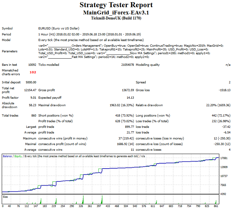 2/ التجربة الثانية: مدة سنة و نصف على الزوج eurusd و الفريم الساعة برصيد 5000 دولار