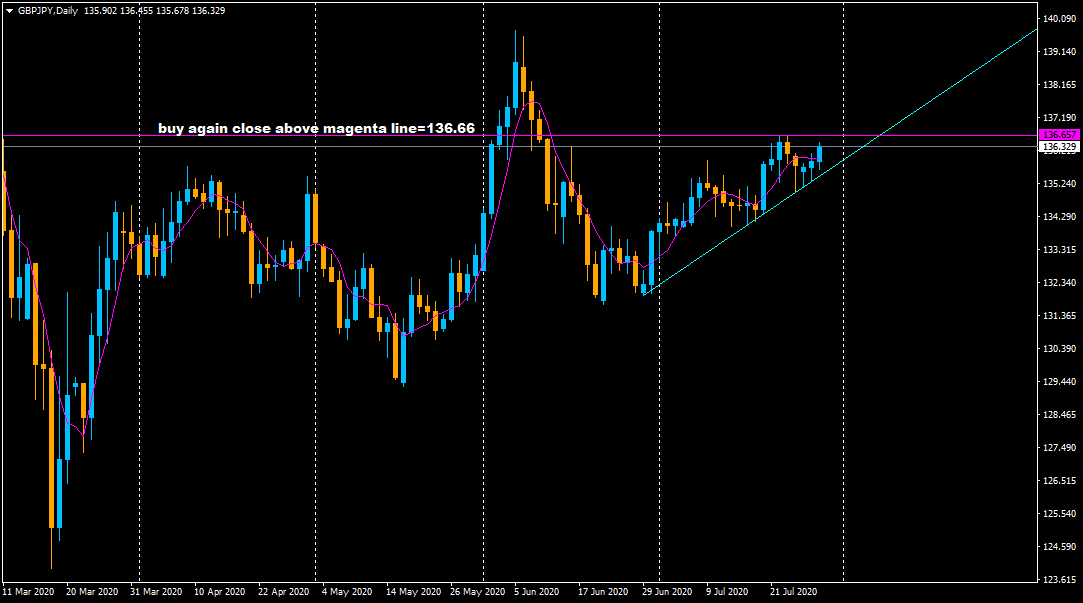 شراء تعزيز- اذا كسر خط الماجنتا و أغلق فوقه على اليومي عند 136.66 مع هدف=137.75--و ستوبلوس تحت خط الترند