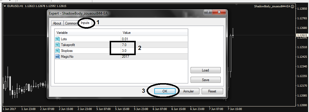 عند سحب الاكسبيرت على الشارت (أو كليك على الوجه المبتسم للاكسبيرت إذا كان على الشارت) وقبل الضغط على ok ستقوم بتعديل الاعدادات كما بالصورة أسفله :