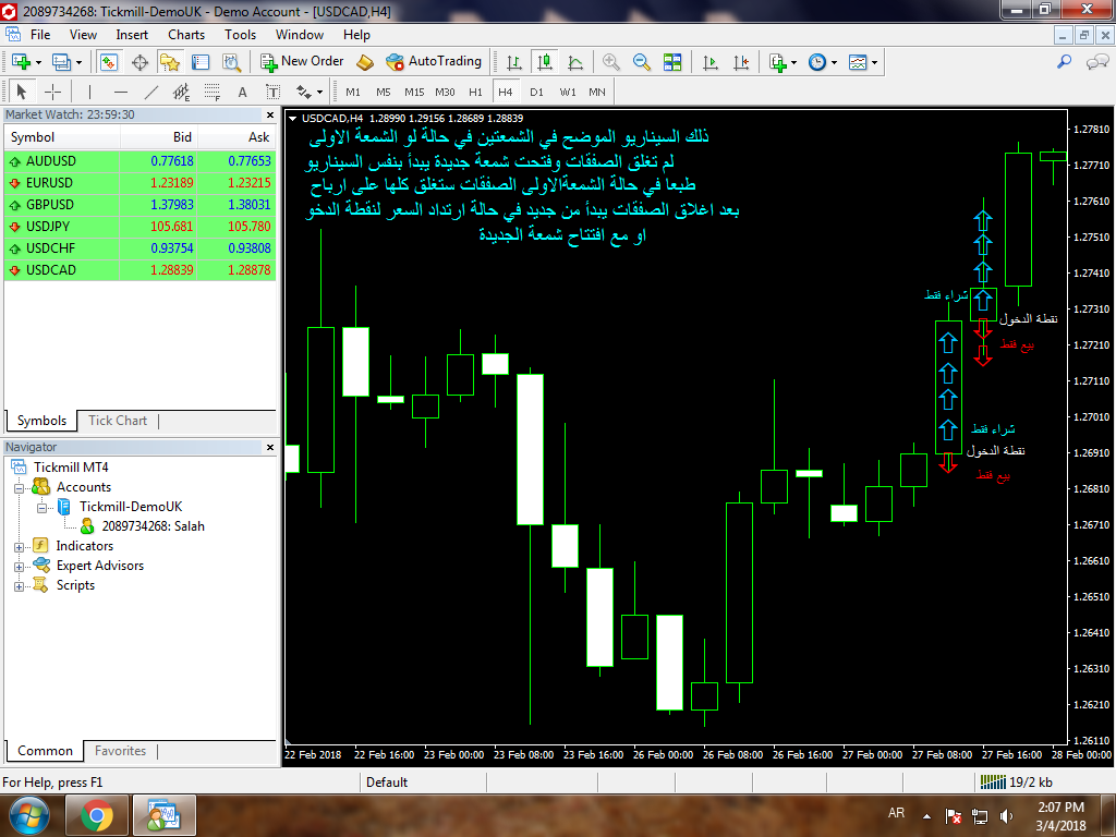 طبعا ستكون الصفقات مفتوحة وستبدأ شمعة جديدة نفس الكلام المطبق في الشمعة السابقة في حالة تجاه لاعلى يفتح صفقات شراء وفي حالة اتجاه السعر لاسفل يفتح صفقات بيع وهكذا نفس السيناريو مع كل شمعة