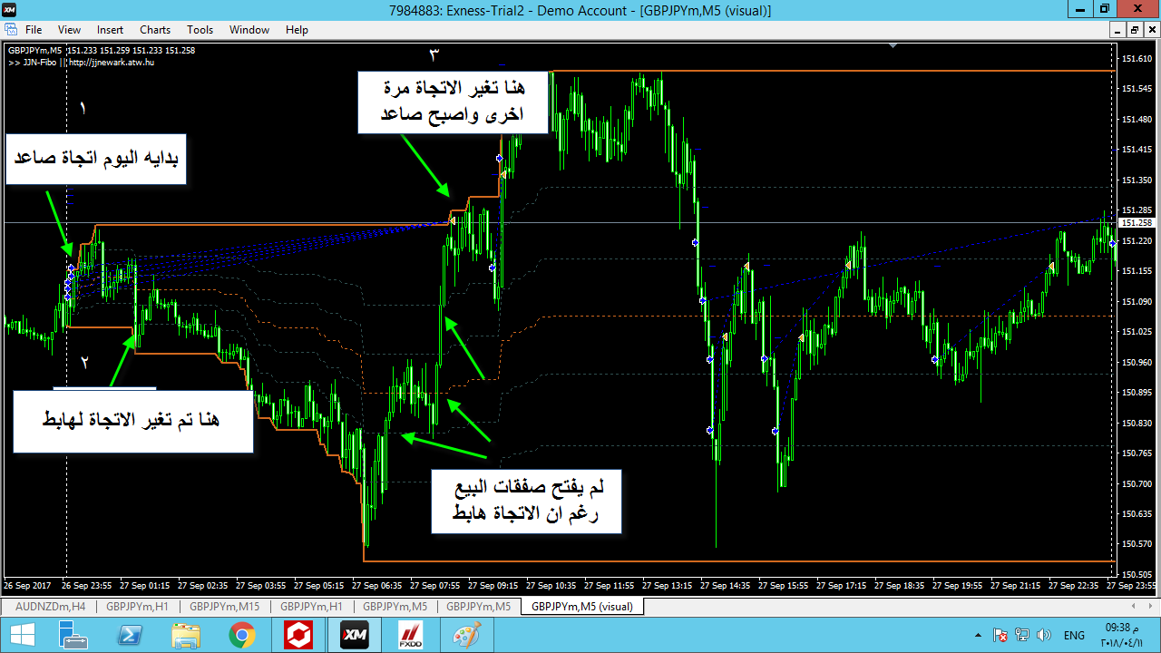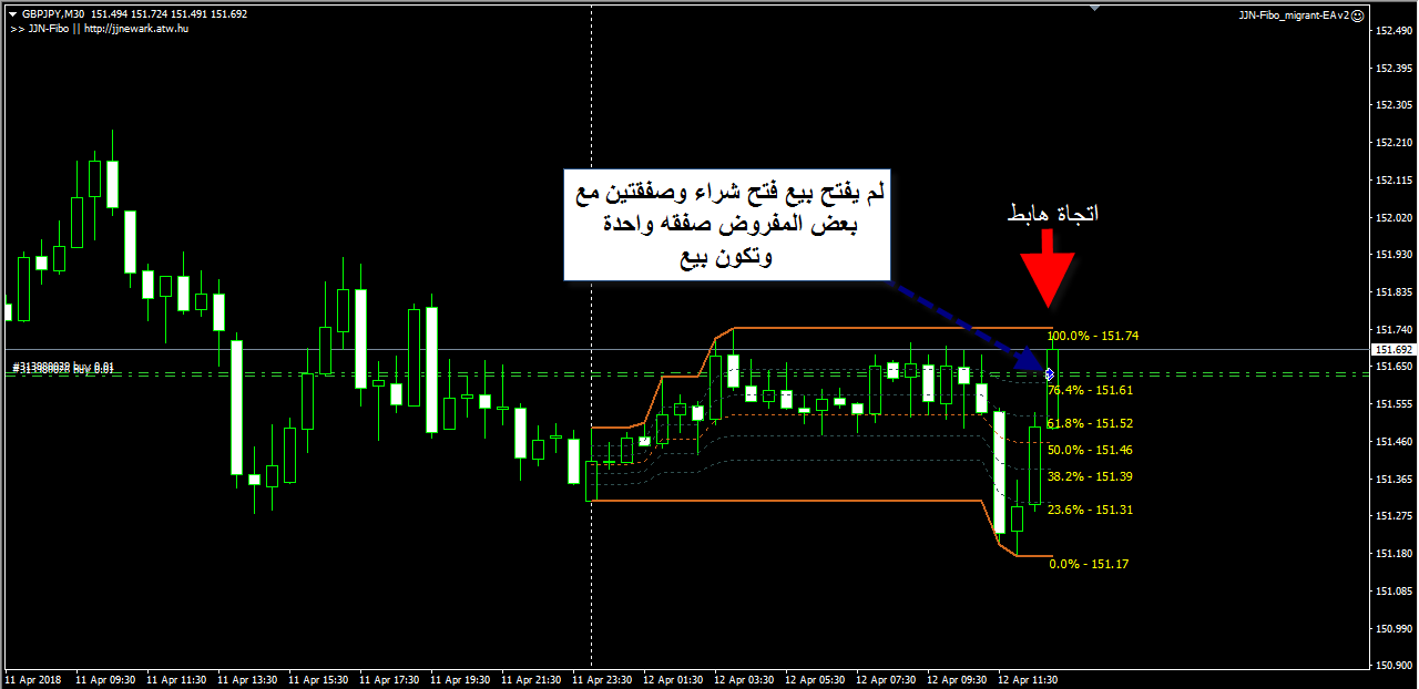 هذة صورة توضح الاتجاة هابط باعدادات المؤشر الافتراضيه لم استخدم خاصيه التايم فريم ولاكن لونت المستويات بللون الاصفر فى المؤشر والاكسبرت لكى يتوافق وفتح شراء صفقتين من نفس المكان والمفروض كانت تبقى صفقه بيع واحدة فقط لاان الاتجاة هابط