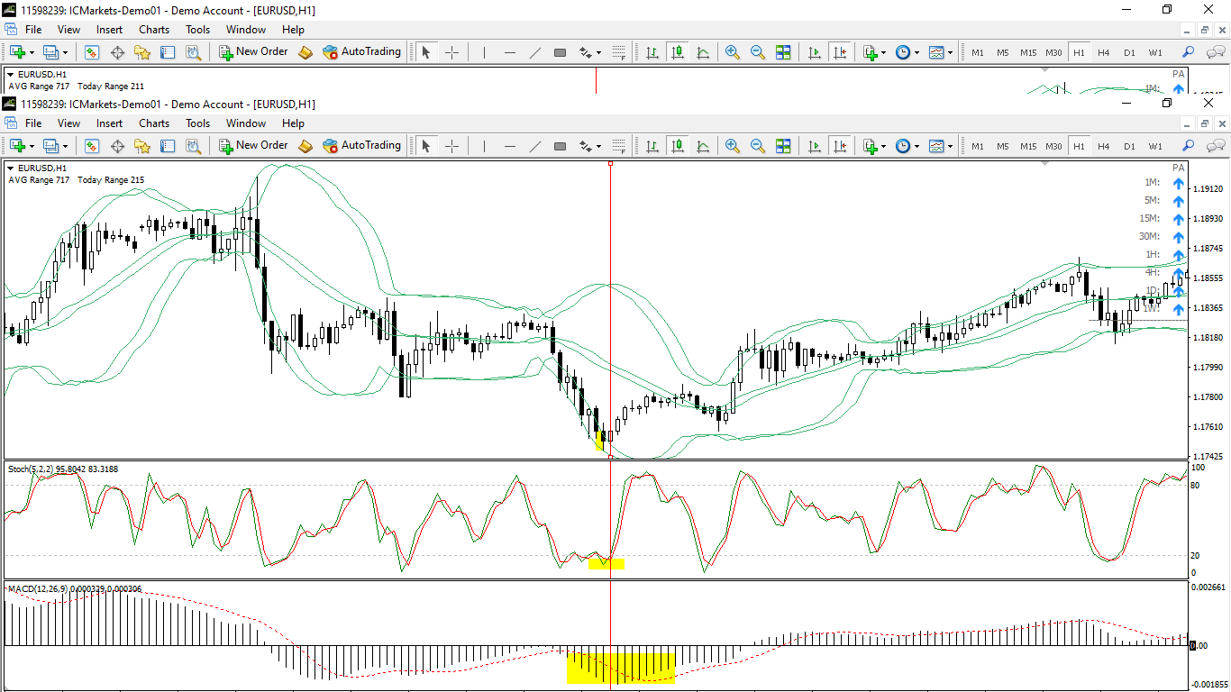 الشمعه الي عليها خط الي تم الدخول من افتتاحها بمجرد ان الي قبلها اغلقت فوق الحد السفلي للبولنجر وكان الاستوكاستك تشبع او حتي عند مستوي ال 20 والماكد تحت الصفر الي هو الخط الاوسط