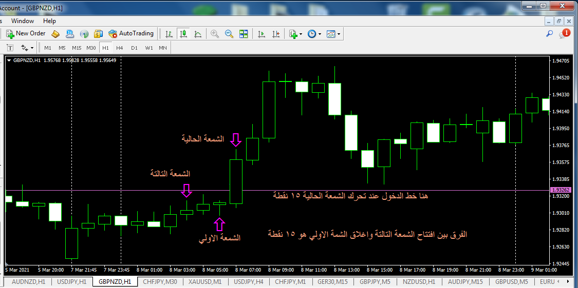 ان بعد اغلاق الصفقة يفتح صفقة جديدة مع كل افتتاح شمعه ويغلقها مع اغلاقها كما بالصورة