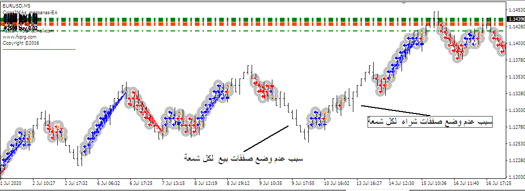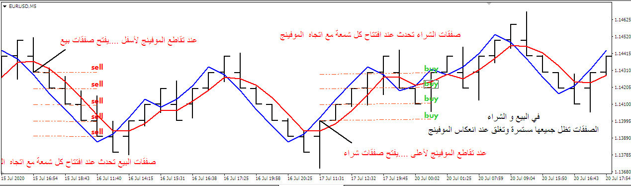 في الصورة بالأسفل اريد مثلا عند التقاطع لأعلى ان يفتح صفقات شراء لكل شمعة حتى لو ظهرت شمعة هابطة يشتري مادام لم يحدث تقاطع عكسي...وكذلك في الشراء.