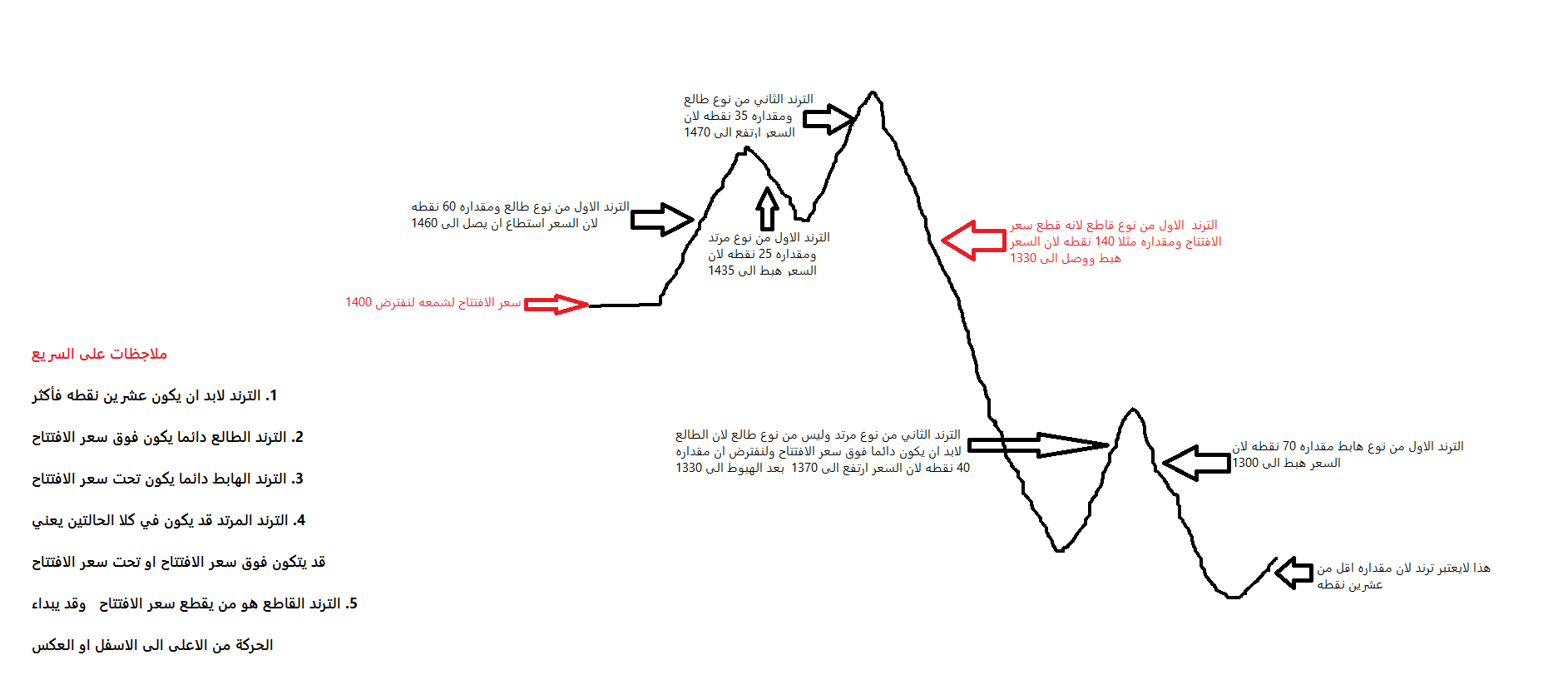 لوافترضنا ان سعر افتتاح الشمعه اليوميه كان 1400 وبعد ها ارتفع السعر الى الاعلى حتى نقطه 1460 يقوم المؤشر باحتساب هذا على انه ترند من نوع طالع ويسميه ترند رقم 1 ومقداره 60 نقطه