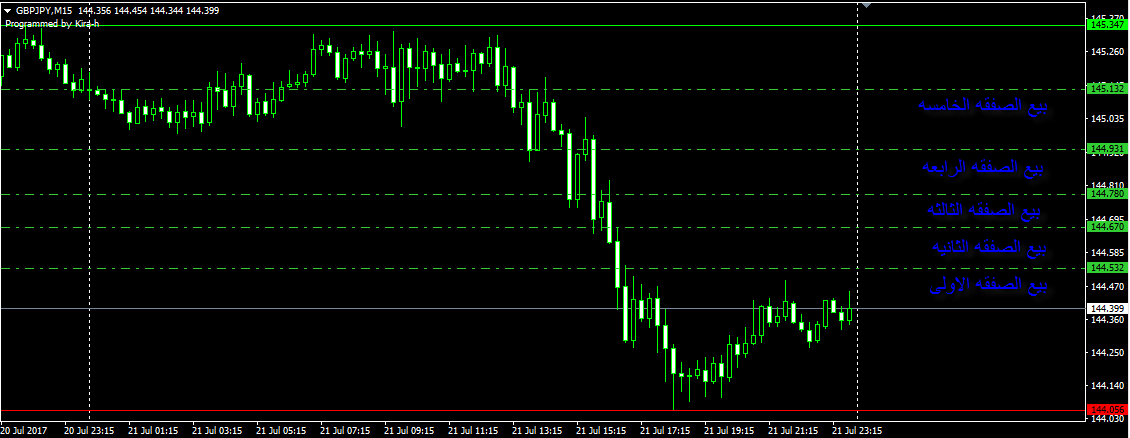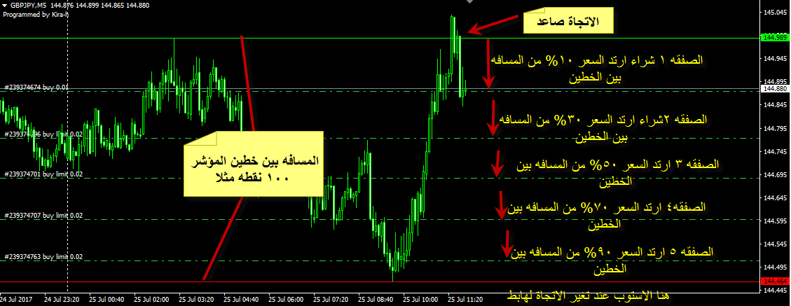 اذا كان الاتجاة صاعد يتم فتح 5 صفقات على بعد مسافات معينه من خط المؤشر الاخضر من تحت الخط كل صفقه لها حجمها وتحديد المسافه الخاصه بها من الاعدادات وكلما يتحقق شرط المسافات يتم فتح الصفقات عند كل تحرك جديد للخط