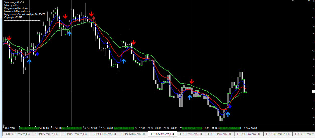 تقاطع الموفنج افرج 5 مع الموفينج افرج 10 و ظهور الاسم الازرق شراء والاحمر بيع: أي أن الشروط تتحقق بشمعة واحدة بعد اغلاقها