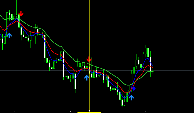 حسب الصورة فالشروط كالتالي : للشراء يجب أن يكون الموفينج السريع فوق البطيئ (فلتر اتجاه وليس تقاطع) + ظهور السهم والدخول بالصفقة بعد اغلاق الشمعة.