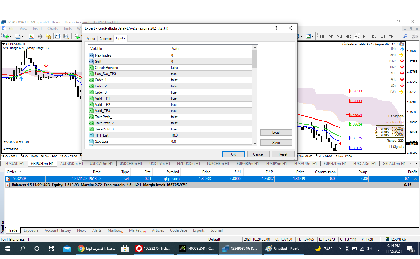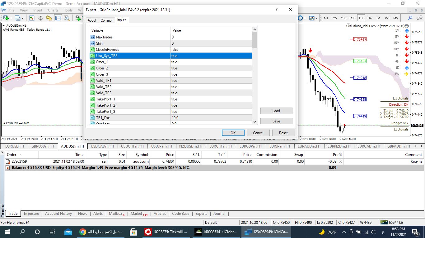 مش عارف اقولك ايه بس جربت علي الاسترالي دولار كما بالصوره المرفقه و الهدف الاول بالفعل تحقق فالمفروض ما يفتحش اي صفقات ويتجاهل الصفقه دي ولكنه فتحها