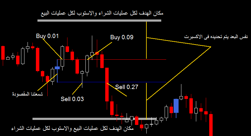 شمعة الساعة كذا مثلا 8 صباحا ، تغلق يحدد الهاى واللو ثم فوق الهاى شراء وتحت اللو بيع ثم على بعد معين من هاى الشمعة (30 نقطة مثلا) يوضع اخذ الربح للشراء وإيقاف الخسارة للبيع