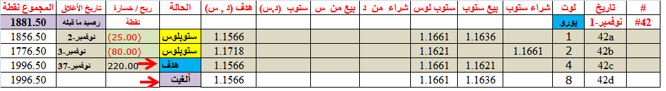 eurusd--الصفقة 42c--4 لوتات--أصابت هدفها و حققت 220ن -- و الربح الصافي=115ن