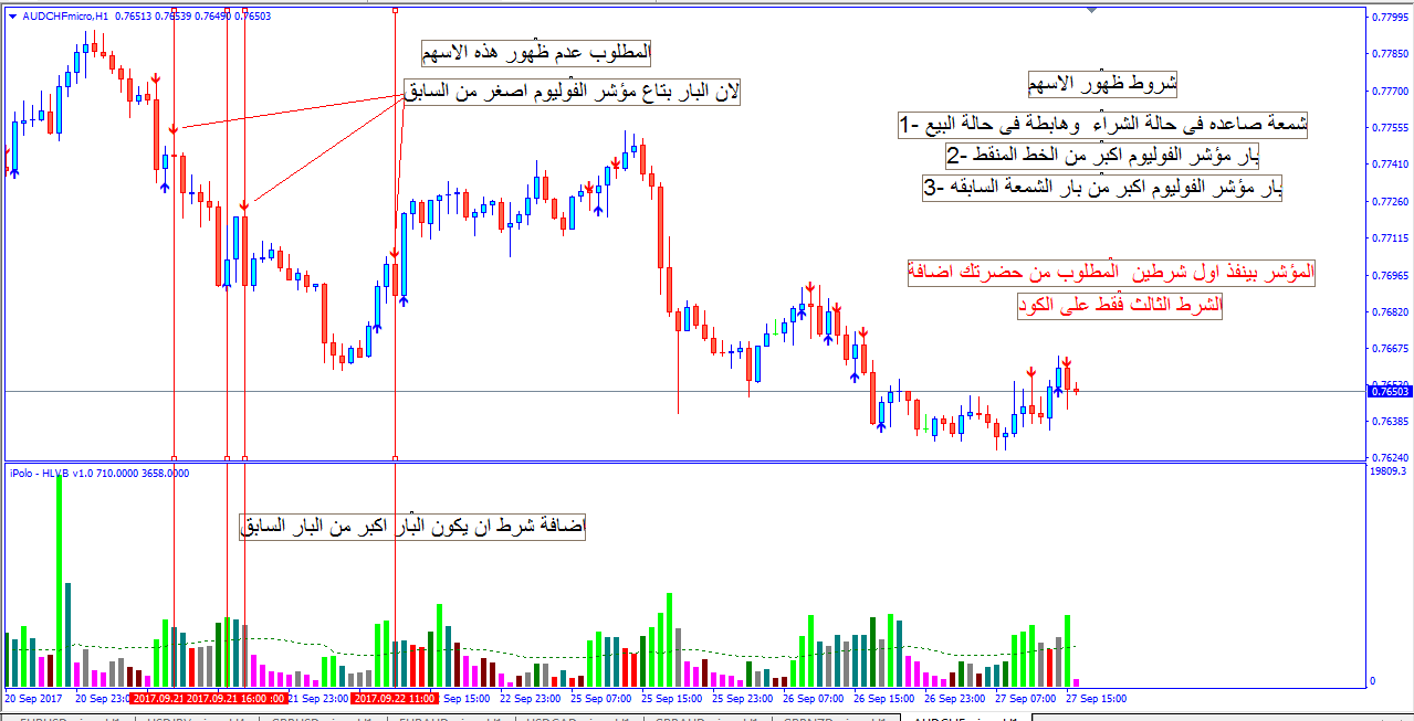 عملت مؤشر اسهم بناءا على مؤشر الفوليوم (مرفق ) وكانت شروط ظهور السهم كالتالى :-