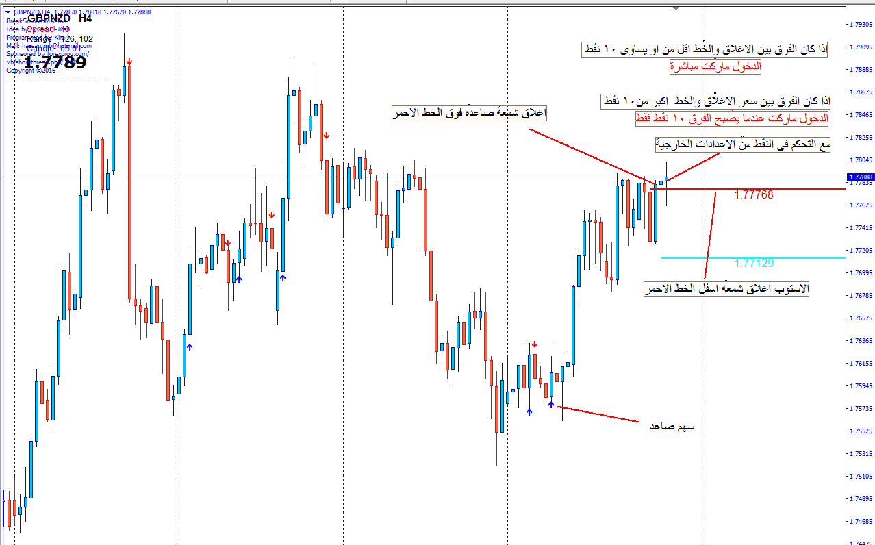 1- اذا كان الفرق بين سعر اغلاق الشمعة و سعر الخط اصغر من او يساوى 10 نقط يتم الدخول مباشرة من سعر الاغلاق