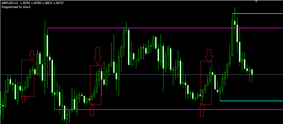 اذا كان الزوج صاعد الى الاعلى بشموع خضراء وكان عدد هذه الشموع 4 خضراء متتالية او اكثر يقوم المؤشر بعمل خط عرضي اسفل اول شمعة خضراء واعلى اخر شمعة خضراء . ونفس الشي مع الهبوط .