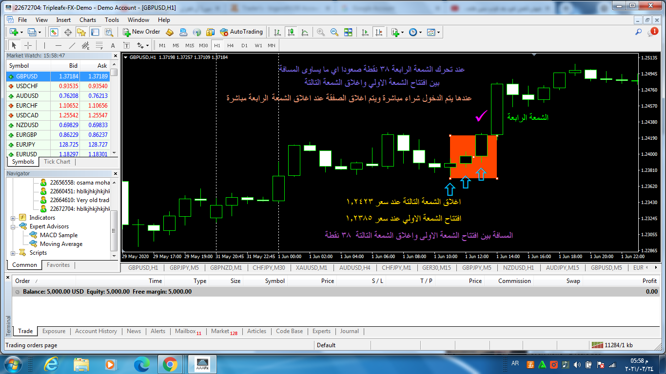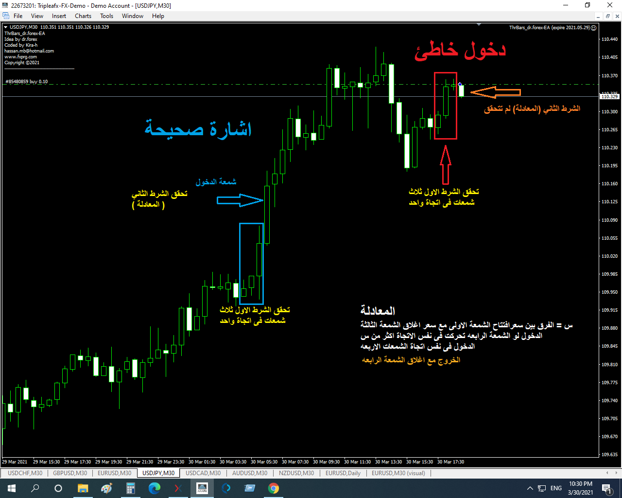 عند افتتاح الشمعة الرابعة الصاعدة وبمجرد تحرك السعر للاعلى عشرون نقطة يتم الدخول شراء