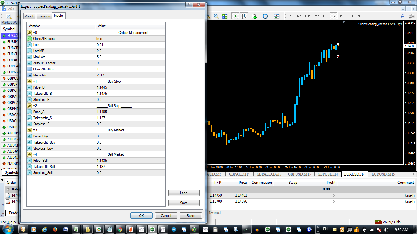 بمجرد سحب الاكسبيرت على الشارت يتم تعليق امرين معلقين شراء ستوب bs1 و بيع ستوب ss1