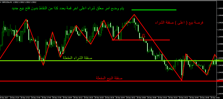 في حال تشكل فرصة بيع جديده وستكون طبعا اعلى صفقة الشراء المفعلة وندخل هنا ب2 لوت ويتم اغلاق الصفقات الرابحة على الربح الحالي وهنا في هذه الحالة ستكون صفقة شراء واحده وبعدها ودخول امر بيع وانتظار السعر تعويض الخساره العائمة