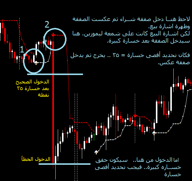 مثال: تم التحديد اقصى خسارة = 35 .. اذا خسرة الصفقة 10 نقاط وظهرة اشارة عكس يخرج من الصفقة ويدخل الصفقة العكس.