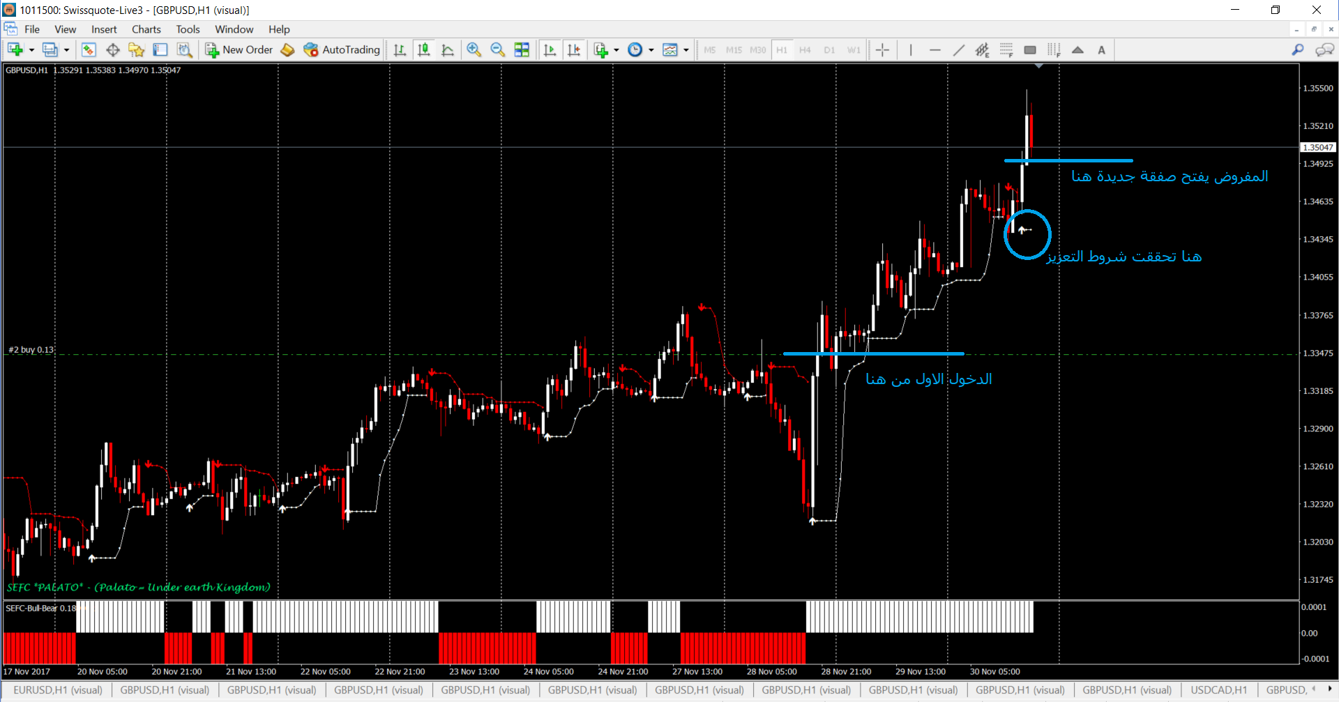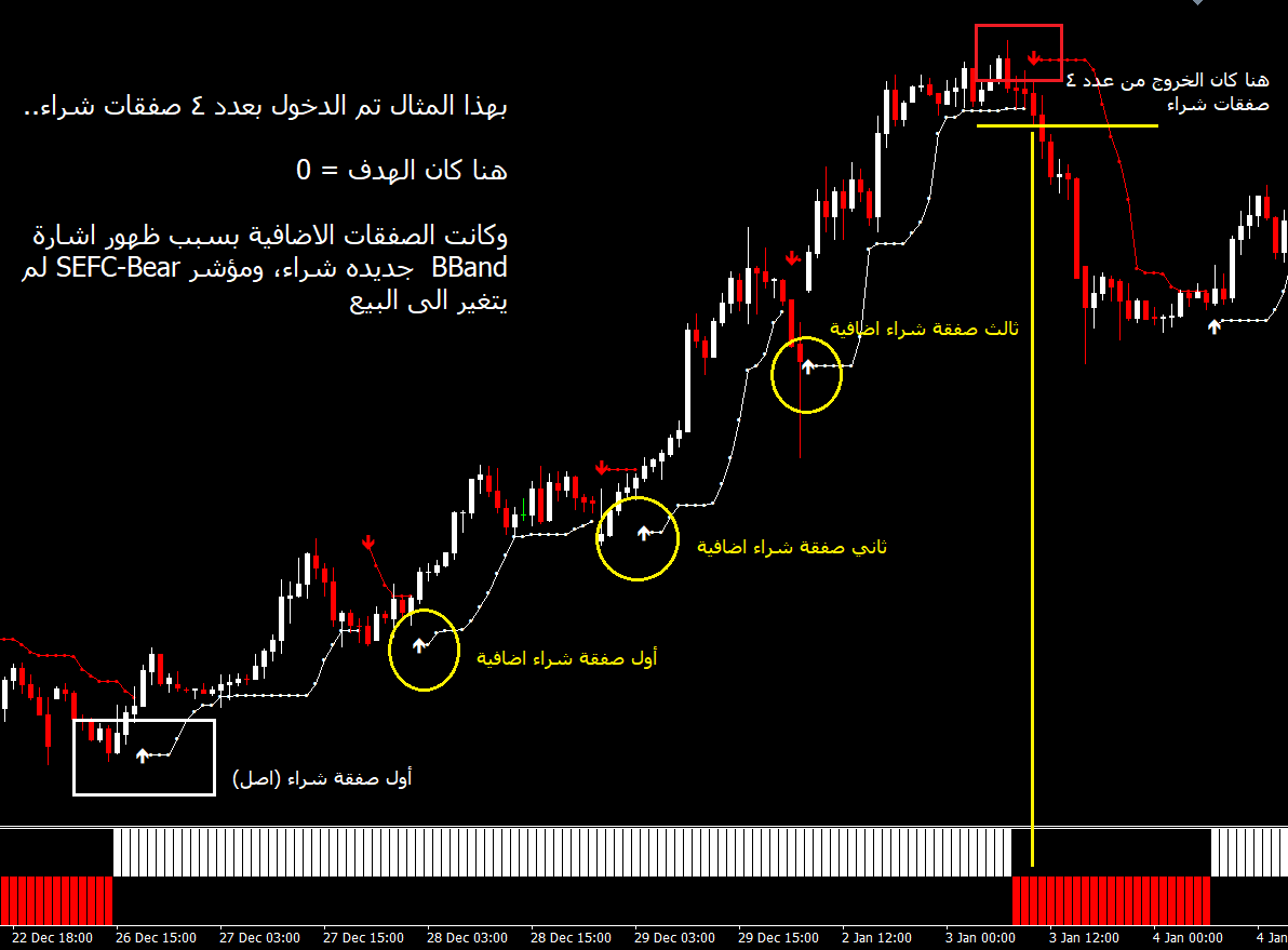 - الصفقات الاضافية بنفس الاتجاه: اذا كانت اشارة المؤشرين شراء. وظهرت اشارة اشارة بيع على BBand ولكن الـ SEFC-Bear لايزال شراء. ثم ارتد السعر صعود وظهرت اشارة شراء جديده مأكده من مؤشر الـ SEFC-Bear.. بدخل هنا الاكسبرت شراء جديد ويبقي القسمه مفتوحة.. انظر الرسم: