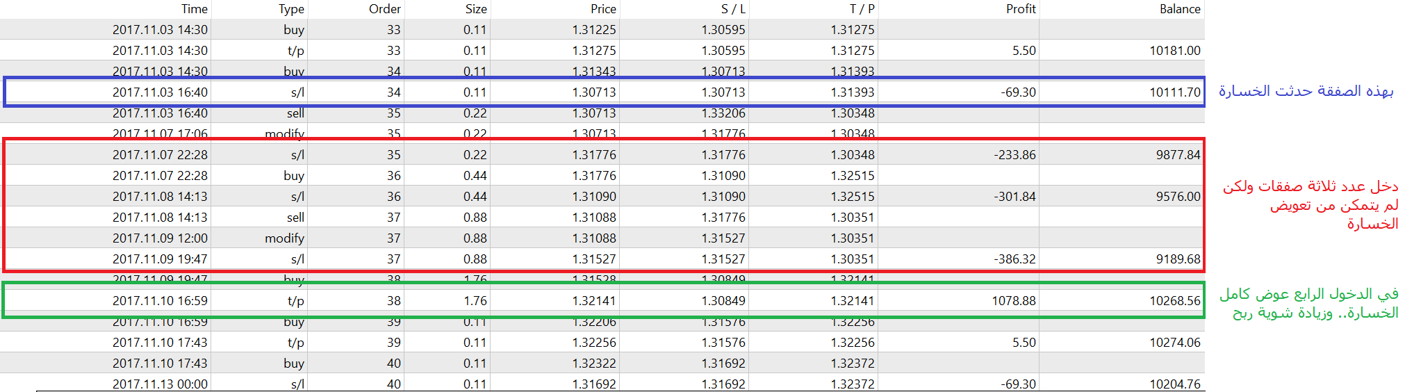 - الصفقات العكس: في حال صفقات العكس المضاعف (ترو)، يدخل صفقة لتعويض الخسارو.. اي يدخل صفقة عكس الاتجاه بحجم لوت = (حجم اللوت الأخير * حجم المضاعفة المحدد). وتكون عدد نقاط الهدف = (اجمالي الخسائر ÷ حجم لوت صفقة العكس المضاعف).
