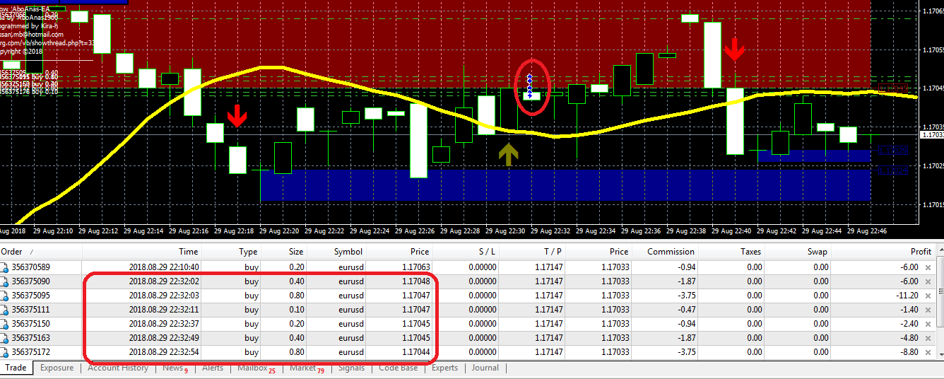 الاكسبيرت يفتح صفقات كثيرة على الشمعة الواحدة وذلك عند ارتداد السعر بعد فتح الصفقة الاولى كما في الصورة المرفقة رغم عمل الستيب 5 نقاط مثلا بين كل صفقة والاخرى