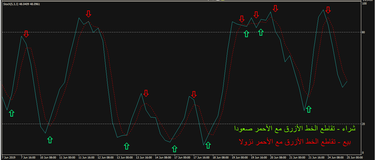 اما الستوكاستيك قلت ان الشرط تقاطع والتقاطع معناه تغير الاشارة من حالة في الشمعة السابقة الى الحالة العكسية باخر شمعة مغلقة، وهذا ما تم عمله.