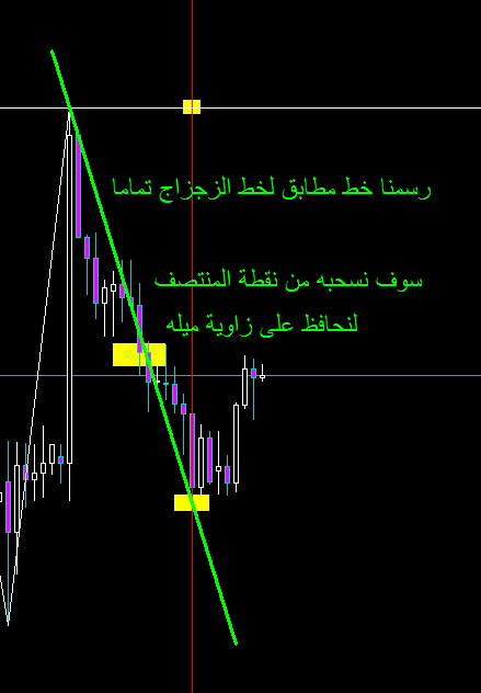 ثم نزيح خط مواز تماما لخط الزجزاج الأخير حتى يصل الى نقطة تقاطع العمودى مع الأفقى ونثبت هذا الخط المائل فإذا قطعه السعر ندخل صفقة