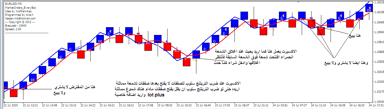 اخي هذا مخالف لشرحك على الشارت بحيث جعلت الدخول عند اغلاق اول شمعة عكسية يعني شمعة حمراء تليها خضراء شراء والعكس بالبيع.