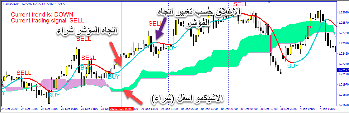 عمل امر جديد يقوم بدمج الاشكيمو مع المؤشر المرفق حيث يفتح الصفقات اذا توفق اتجاه المؤشر مع الاشيكمو ويغلق الصفقه اذا قام المؤشر بتغير الاتجاه (مرفق الشرح)