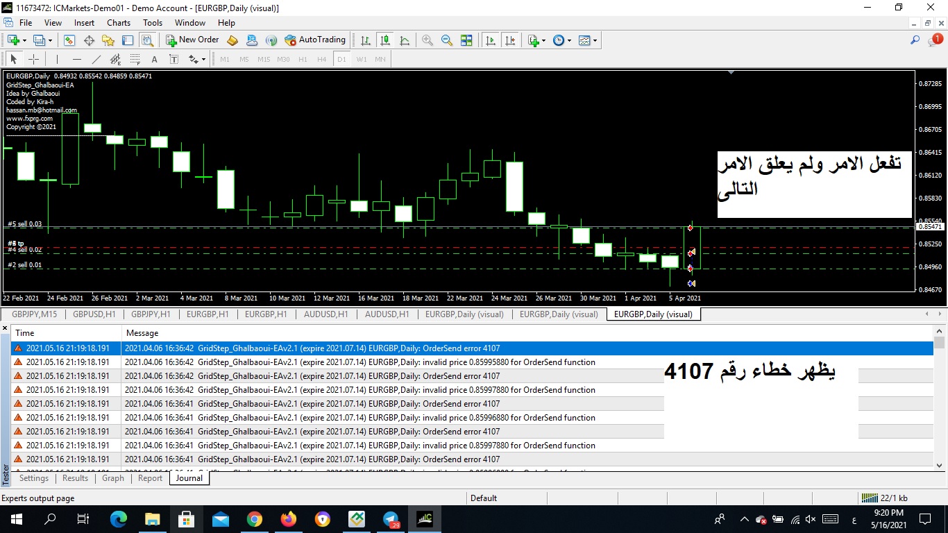 البداية ؛- عند وضع الاكسيبرت على الشارت ينتظر اغلاق الشمعة الحالية ويفتح صفقتين بيع وشراء فى نفس الوقت