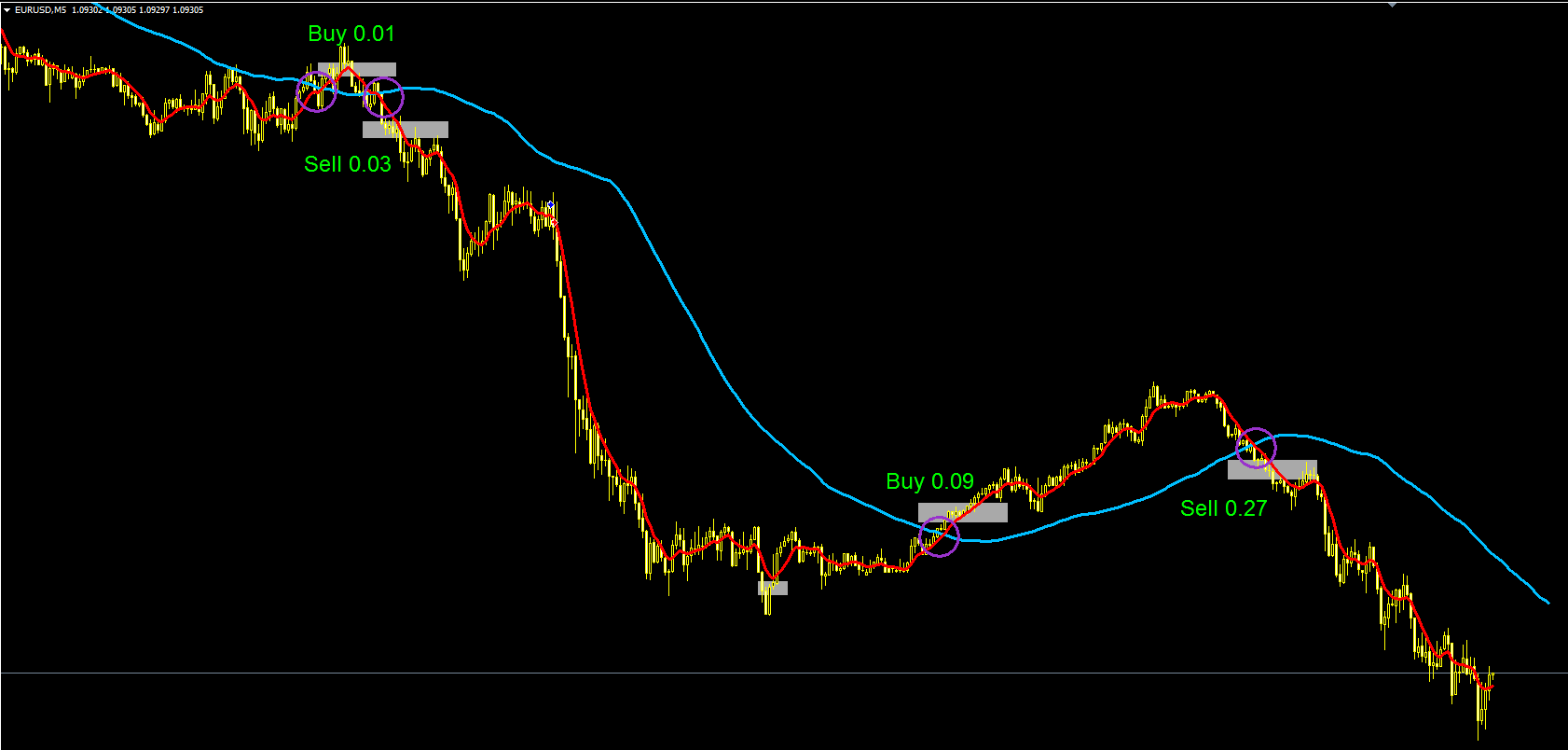 ثم يحدث تقاطع هابط فيفتح الاكسبرت صفقة بيع بـ 0.03 ثم يحدث تقاطع صاعد فيفتح صفقة شراء بـ 0.09 وهكذا