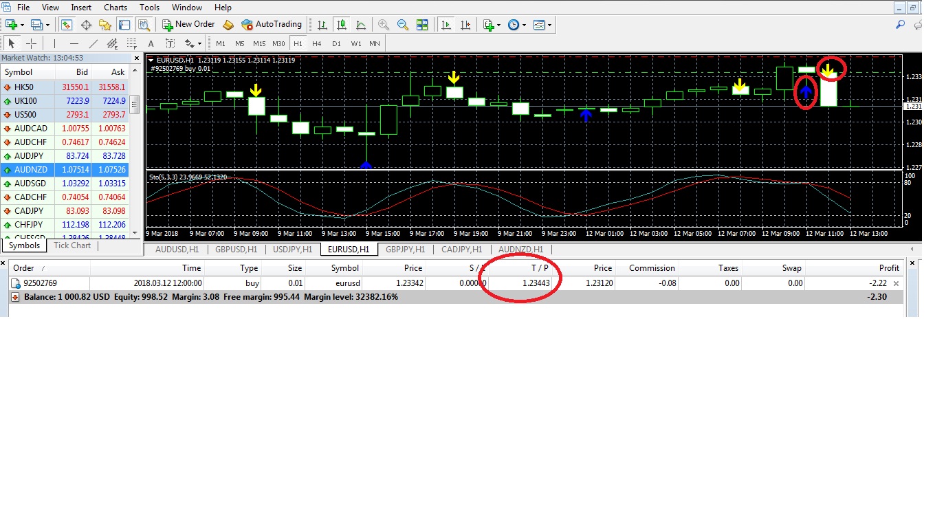 3- اضافة فلترة بسيطة اذا كان مؤشر الاستوكاستك في المنطقة العليا أكبر من 80 لايتم فتح صفقات شراء بل يفتح صفقات بيع فقط وذلك طبقا لاشارة المؤشر StochInd4Hour اما اذا كان مؤشر الاستوكاستك اصغر من المنطقة المنخفضة اصغر من 20 لايتم فتح صفقات بيع بل يفتح صفقات شراء فقط وذلك طبقا لاشارة المؤشر StochInd4Hour ، مرفق صورة للشارت ومبين عليه بالدوائر الحمراء اماكن فتح الصفقات ام الدائرة البيج التي عليها سهم احمر لا يجب فتح شراء لان مؤشر الاستوكاستك عند خط ال 80 فسيتبعها هبوط لانه حدث تشبع شرائي