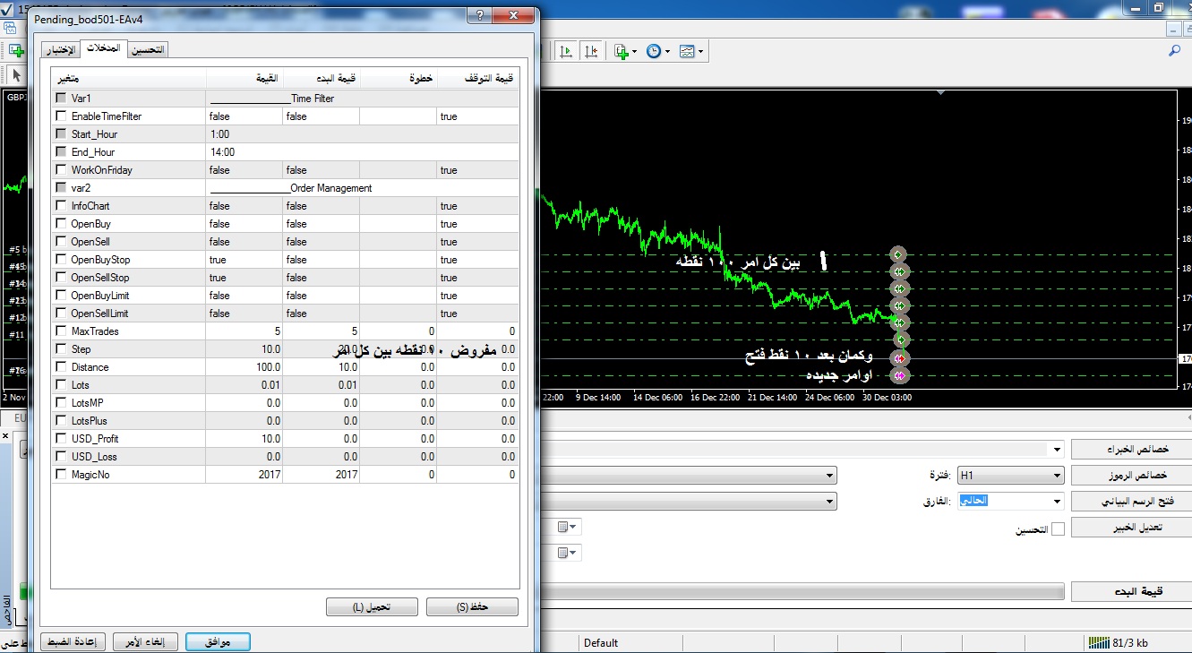 مثال فتح 5 بيع و5 شرا بلوت الجمع 0.01 الى 0.05 الاوردر التاني 0.06الى 0.1 لازم يكون جمع لتحقيق الهدف ثم العوده من جديد