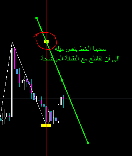 ثم نزيح خط مواز تماما لخط الزجزاج الأخير حتى يصل الى نقطة تقاطع العمودى مع الأفقى ونثبت هذا الخط المائل فإذا قطعه السعر ندخل صفقة
